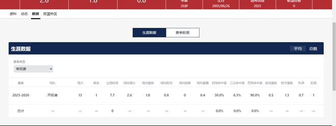 杨瀚森的三分投射极不稳定,目前场均命中率只有6.3%。