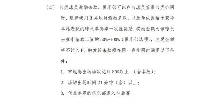 除了年薪方面能够拿到550万元外,《2025-2026赛季CBA联赛球员选秀、工资帽、聘用及交易管理规定》中还有一个条款,表示球队和球员签署B类合同时,可以选择使用B类球员激励条款,具体就是球队给予获得卓越表现的球员单赛季一次性奖励,奖励金额为该球员当赛季基本工资的 50%-100%(俱乐部选项),奖励金额将不计入国内球员赛季整体奖金限额。该条款对球员也有三个要求:一是常规赛出场场次要达到80%(含)以上;二是场均出场时间21分钟(含)以上;三是代表参赛的俱乐部进入季后赛。