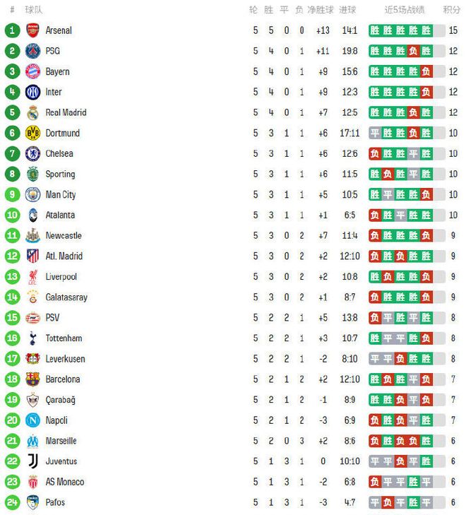 欧冠5轮后积分榜巨变 阿森纳5连胜领跑 2队遭首败 利物浦巴萨陨落