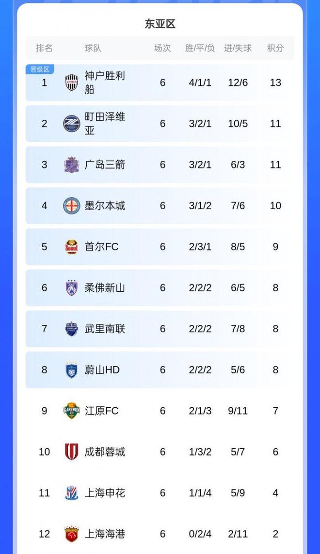 前一个比赛日,两支中超球队上海海港、成都蓉城提前出战,最终上海海港客场0-0打平柔佛新山,成都蓉城客场2-2打平神户胜利船,都没有输球。